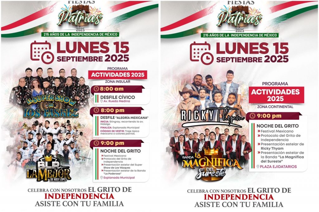 El festejo dará inicio con el desfile “Alegría Mexicana”, que recorrerá la Avenida Hidalgo desde el Stingray hasta la Explanada Municipal, donde se llevará a cabo el festival con espectáculos culturales y artísticos. Posteriormente, Gómez Ricalde encabezará la ceremonia del Grito junto a funcionarios y familias isleñas.