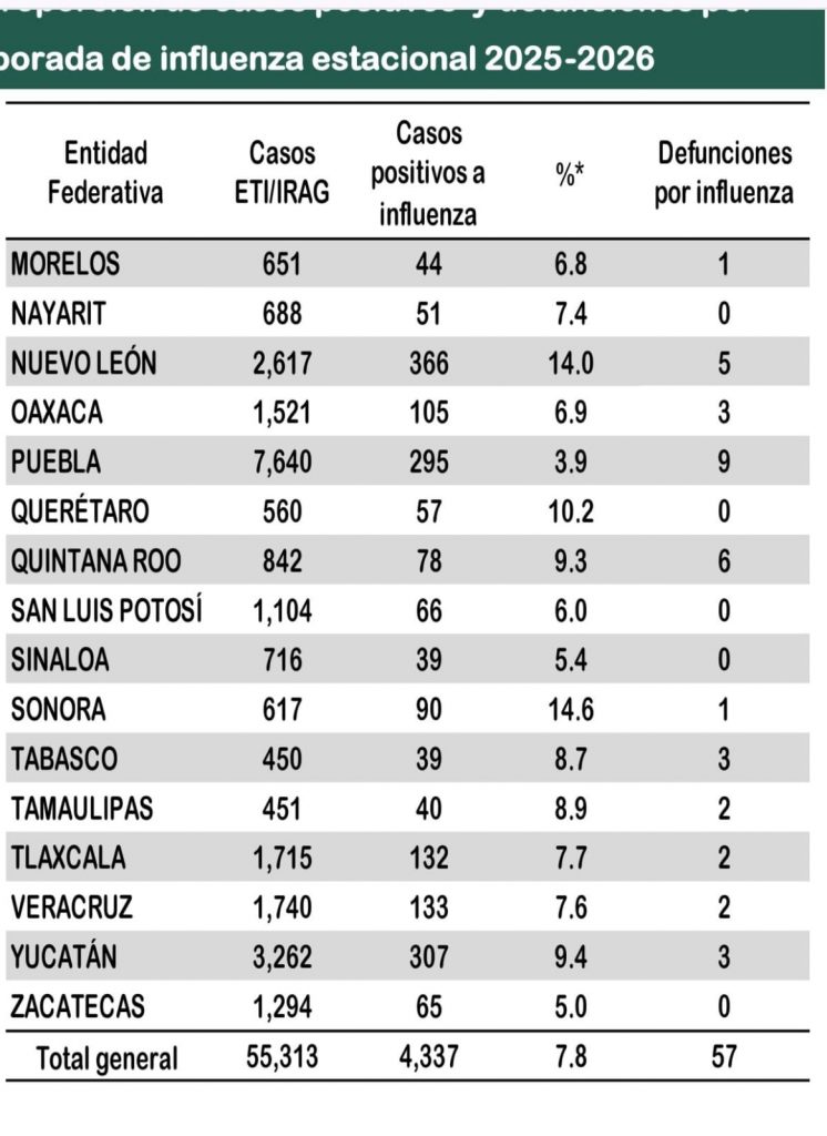 El informe del Sistema de Vigilancia epidemiológica de la SSA, dio a conocer que en la semana 01 reportaron 68 casos positivos y cuatro defunciones; en la semana 02 fueron 75 casos positivos y seis muertes por influenza estacional.