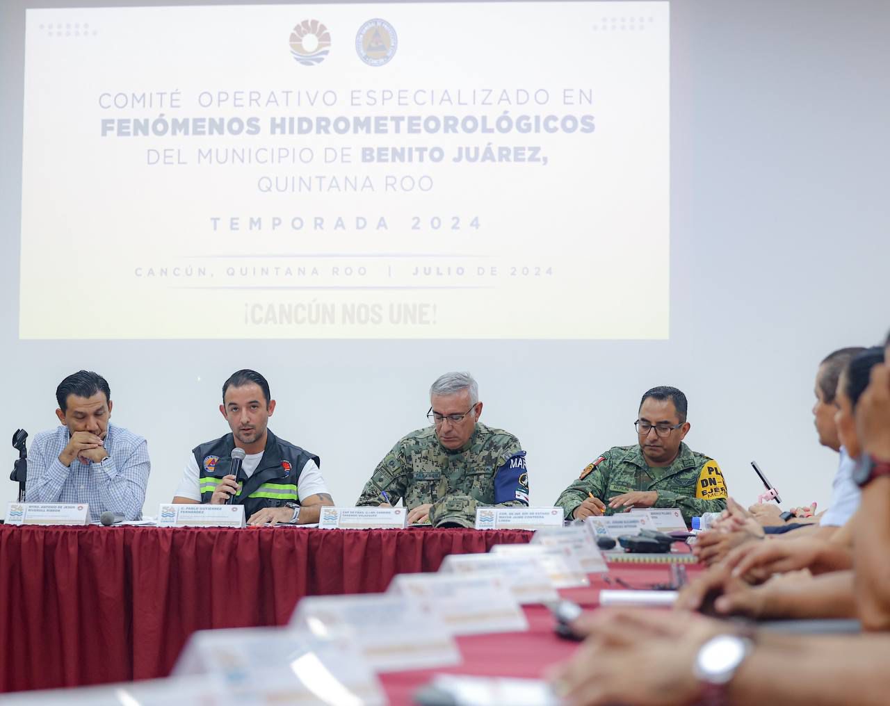 Cancún.- Con la presencia del Encargado de Despacho de la Presidencia Municipal de Benito Juárez, Pablo Gutiérrez Fernández, se dio inicio a la Sesión Permanente del Comité Operativo Especializado en Fenómenos Hidrometeorológicos del Municipio de Benito Juárez, en respuesta a la alerta verde por el huracán “Beryl”, ahora categoría cuatro en la escala Saffir-Simpson.
