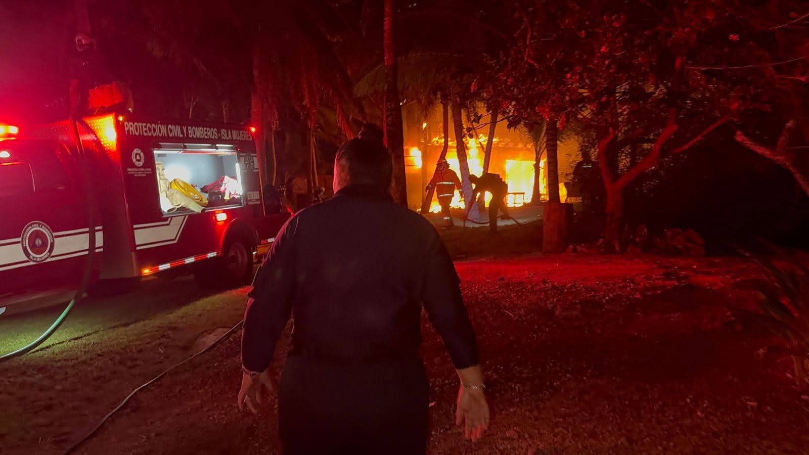 Isla Mujeres.-Incendio en una villa sobre la carretera Perimetral del Mar Caribe, en Isla Mujeres, fue sofocado por personal de la Coordinación Municipal de Protección Civil de Isla Mujeres esta noche, dejando como saldo solo daños materiales.