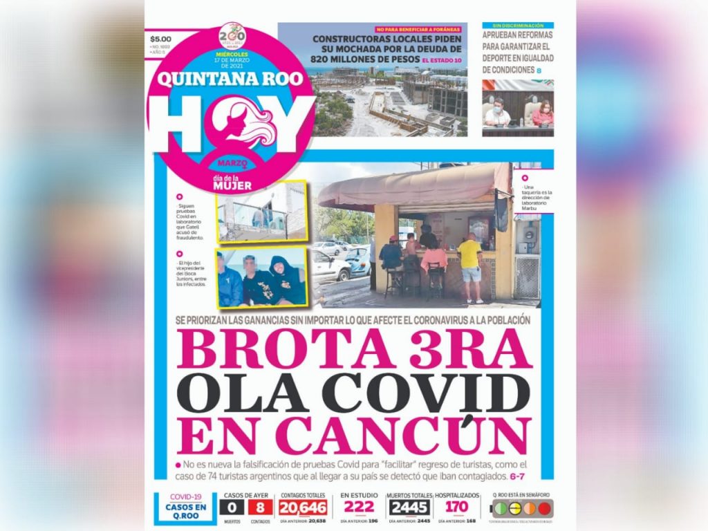 No es la primera vez que los gobiernos municipal y estatal, en contubernio con empresarios dueños de antros, hoteles y restaurantes, son denunciados a nivel mundial por la poca seriedad en sus protocolos, el turno le tocó este fin de semana a un grupo de 169 jóvenes argentinos, que llegaron al paradisíaco Cancún para festejar su graduación escolar. Antes de salir del destino turístico, todos dieron negativos en las pruebas para detectar el SARS-COV2, pero nueve horas después, al llegar a Buenos Aires, 74 de ellos estaban contagiados, según las pruebas obligatorias a su ingreso.