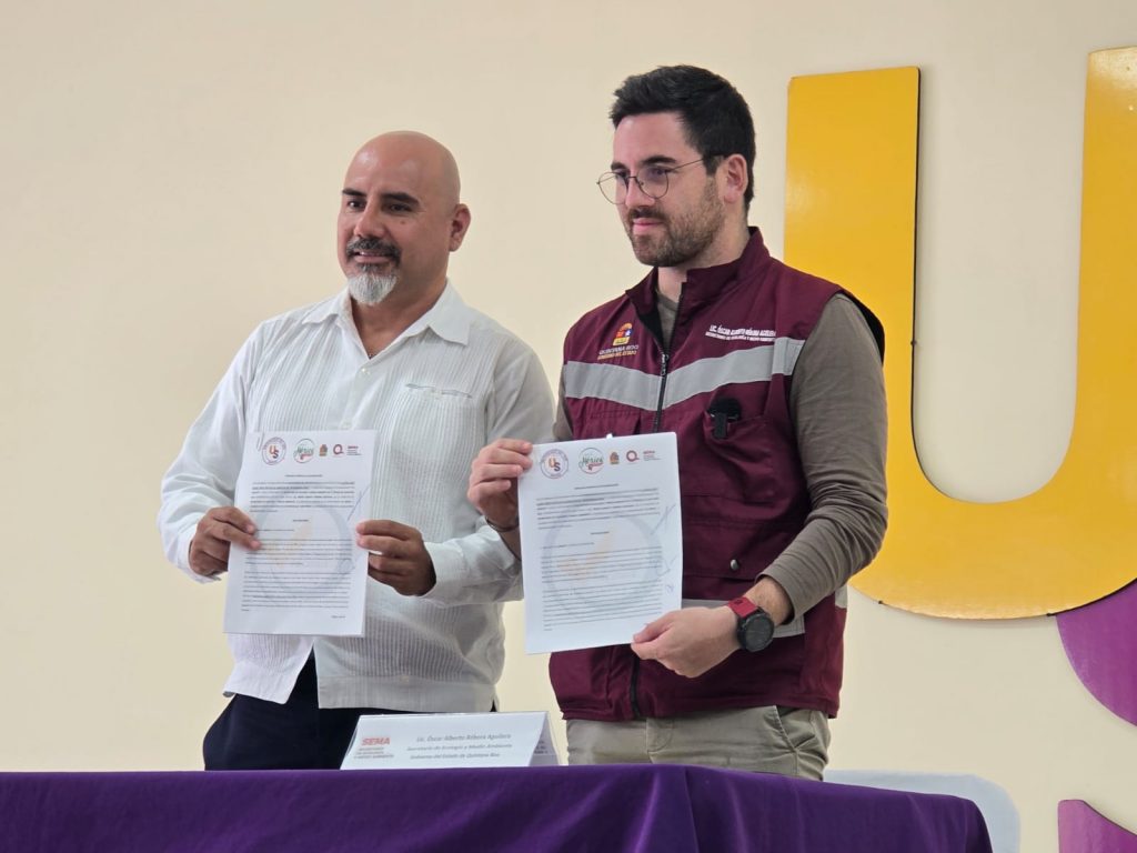 Cancún. – El secretario de Ecología y Medio Ambiente del Estado de Quintana Roo, Óscar Alberto Rébora Aguilera, firmó un convenio de colaboración y vinculación institucional con la Universidad del Sur, representada por su secretario técnico, Nelson Pérez Hernández, con el propósito de fortalecer la formación ambiental y generar proyectos académicos orientados a la sostenibilidad.