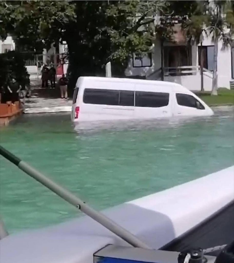 Según un video que circuló en redes sociales, el incidente ocurrió cerca de las 2 de la tarde, cuando la van terminó dentro de la laguna tras una mala maniobra en la rampa del Cenote Esmeralda.