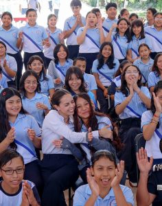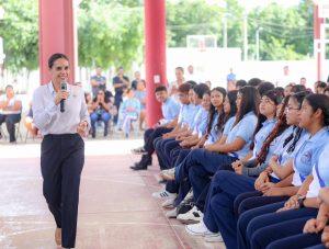 En la secundaria general “8 de Marzo” en la Supermanzana 249, Ana Paty Peralta dialogó con los adolescentes y les pidió que abran sus sentidos para adquirir tres superpoderes como la empatía, la valentía y pertenecer a una comunidad que puede ser el ejemplo de unión y ayuda.