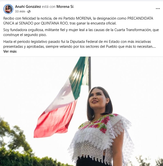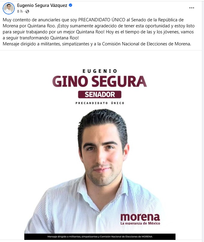 “¡Estoy sumamente agradecido de tener esta oportunidad y estoy listo para seguir trabajando por un mejor Quintana Roo! Hoy es el tiempo de las y los jóvenes, vamos a seguir transformando Quintana Roo! Mensaje dirigido a militantes, simpatizantes y a la Comisión Nacional de Elecciones de Morena, dijo en rede sociales”