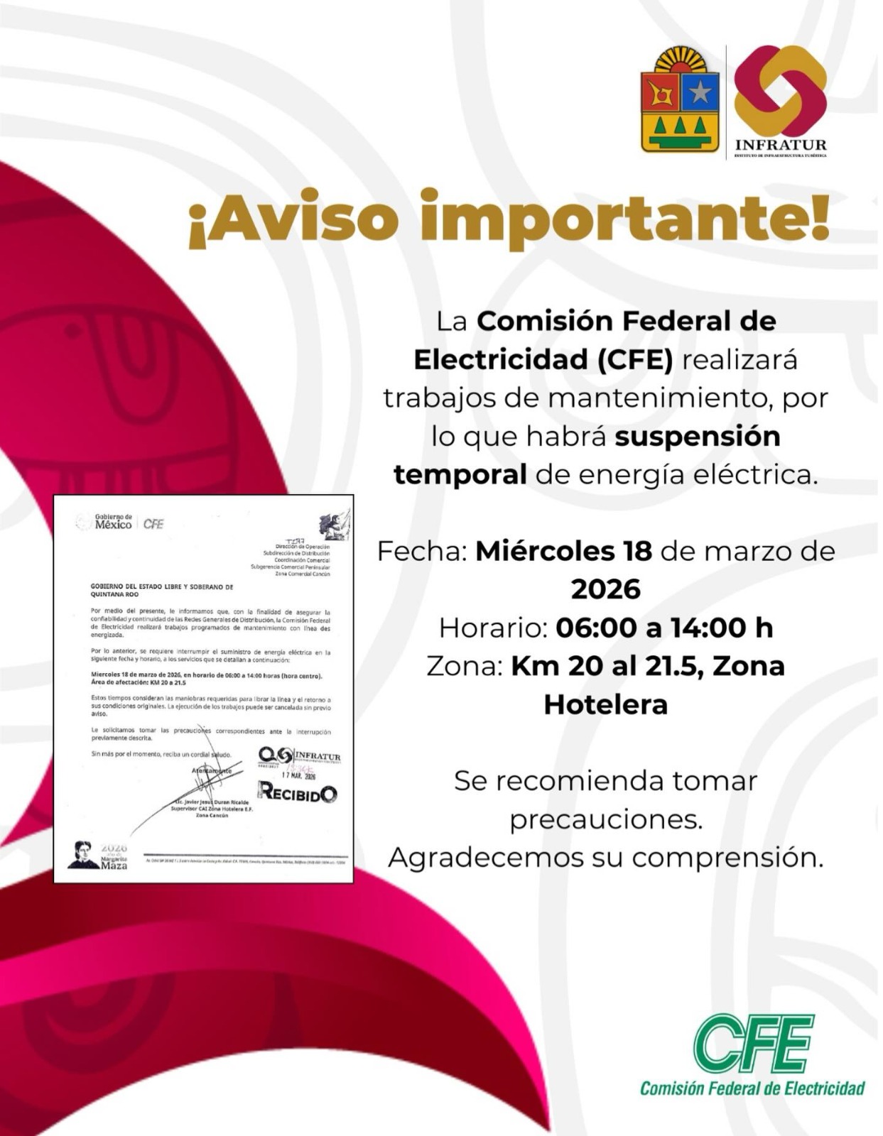 Por ello, se llevará a cabo una interrupción temporal del suministro de energía el miércoles 18 de marzo de 2026, en un horario de 06:00 a 14:00 horas, como parte de estas labores técnicas.