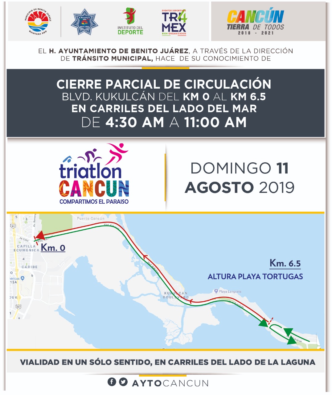 Cancún, Q.R.- A partir de las cuatro de la mañana del domingo 11 de agosto, los carriles del lado del mar en el Boulevard Kukulcán, entre el kilómetro 0 y el 6.5 serán cerrados debido a la logística para la realización del “Triatlón Cancún 2019”, por lo que se exhorta a automovilistas, trabajadores turísticos y visitantes, tomen sus precauciones.