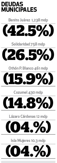CANCÚN, Q. Roo.- Los 11 nuevos gobiernos municipales heredan una deuda conjunta de 2,911 millones de pesos, de la cual Benito Juárez y Solidaridad acaparan el 68.6%. Ambos municipios se sitúan entre los primeros a nivel nacional en volumen de deuda y Solidaridad como el número 1 a nivel nacional en deuda per cápita.