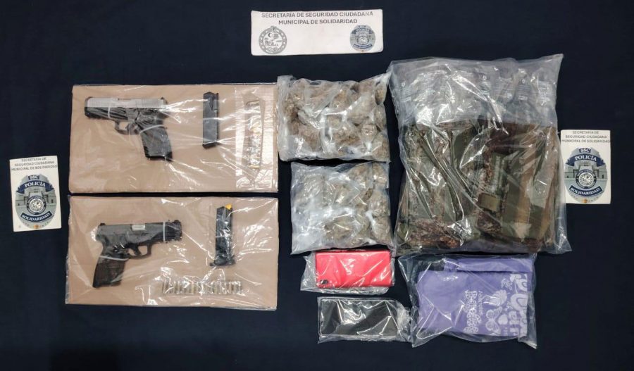 Durante un operativo de vigilancia en la Avenida Constituyentes, policías preventivos observaron a dos personas que coincidían con la descripción de un reporte ciudadano por actividades sospechosas. Tras una inspección, se encontraron 44 envoltorios de vegetal verde con características propias a la marihuana, dos armas de fuego, 32 cartuchos y dos teléfonos móviles.