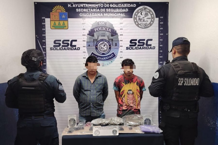PLAYA DEL CARMEN.- La Secretaría de Seguridad Ciudadana Municipal de Solidaridad aseguró a dos individuos en el fraccionamiento Villas del Sol por presuntos delitos contra la salud.