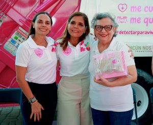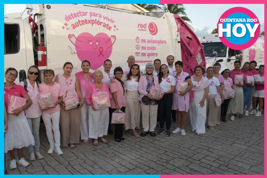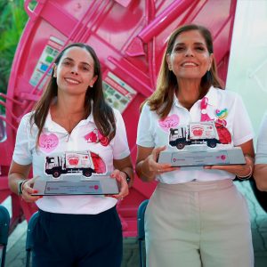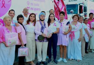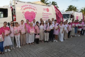 Cancún,.- En el marco del mes de sensibilización sobre el cáncer de mama, la Presidenta Municipal, Ana Paty Peralta y la titular honoraria del Sistema para el Desarrollo Integral de la Familia (DIF) Quintana Roo, Verónica Lezama Espinosa, dieron el banderazo de salida de dos camiones recolectores rotulados en color rosa de la empresa Red Ambiental y encabezaron la entrega de 23 prótesis mamarias externas y brasieres ortopédicos a mujeres beneficiarias de diversas asociaciones civiles, como parte de la quinta edición de la campaña “Detectar es vivir: autoexplórate”.