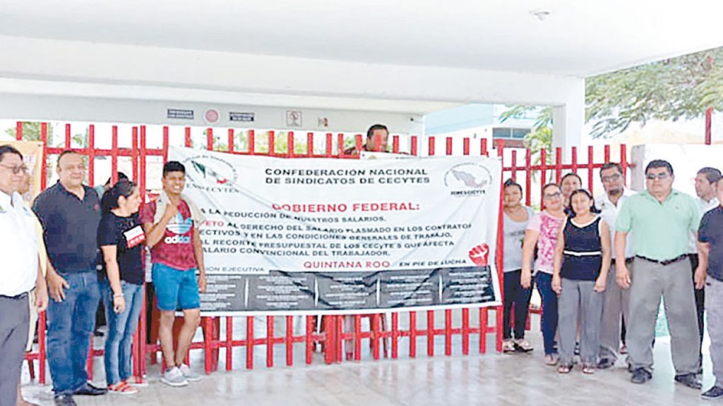 CANCÚN.- Ante la falta del pago de aguinaldo, el ISR, y la política salarial entre otras prestaciones, docentes del Cecyte plantel 1 ubicado en Cancún, se unió al paro convocado a nivel federal, señaló, Heydi Cauich, Delegada Sindical del Plantel 1 del Colegio de Estudios Científicos y Tecnológicos (Cecyte)