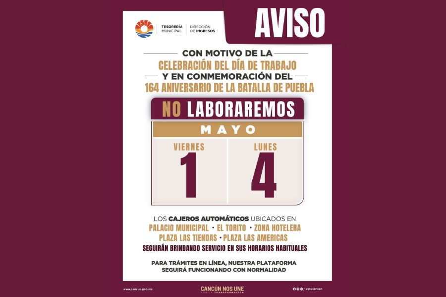 El Ayuntamiento de Benito Juárez anunció el cierre de cajas y módulos los días 1 y 4 de mayo por asuetos oficiales, invitando a los ciudadanos a realizar sus pagos en línea o en cajeros inteligentes disponibles en Cancún.