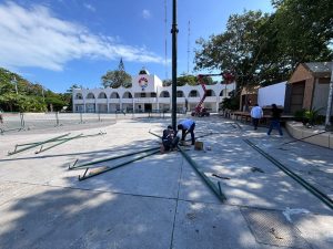 Cancún.- El Ayuntamiento de Benito Juárez inició este lunes 24 de noviembre con el montaje de la decoración navideña en la explanada de la Plaza La Reforma.