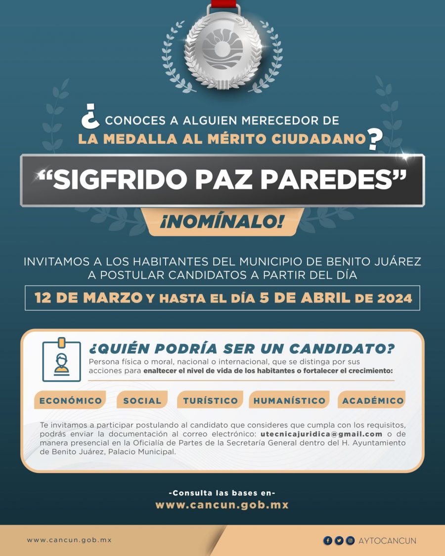 Cancún, Q. R., a 15 de marzo de 2024.- En el marco del 54 aniversario de Cancún, fecha importante para la ciudad y para la preservación de la educación y cultura, el Ayuntamiento de Benito Juárez invita a la ciudadanía a postular a candidatos a la Medalla al Mérito Ciudadano “Sigfrido Paz Paredes”, en su edición 2024.