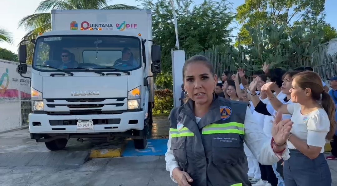 CANCÚN.- La gobernadora Mara Lezama Espinosa dio el banderazo de salida de la primera ayuda de Quintana Roo de 50 toneladas de alimentos, artículos de higiene, medicamentos y ropa para los damnificados por el huracán OTIS en Guerrero y agradeció todo el apoyo de la sociedad quintanarroense que se ha sumado para ayudar a quienes más lo necesitan.