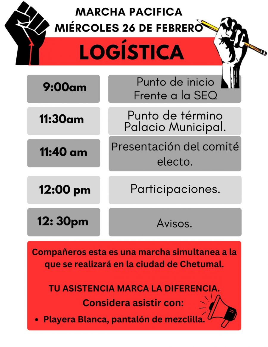 “Se está haciendo la convocatoria para los que no puedan trasladarse a Chetumal por la cuestión de la distancia, por el costo que genera, para que los maestros de municipios cercanos puedan venir a esta marcha”, agregó.