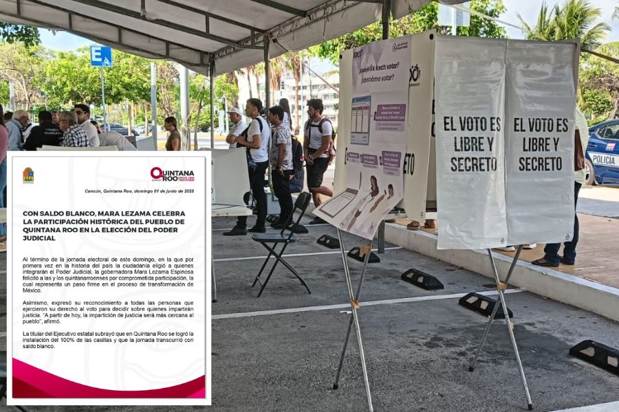 Cancún.- Al término de la jornada electoral de este domingo, en la que por primera vez en la historia del país la ciudadanía eligió a quienes integrarán el Poder Judicial, la gobernadora Mara Lezama Espinosa felicitó a las y los quintanarroenses por comprometida participación, la cual representa un paso firme en el proceso de transformación de México.
