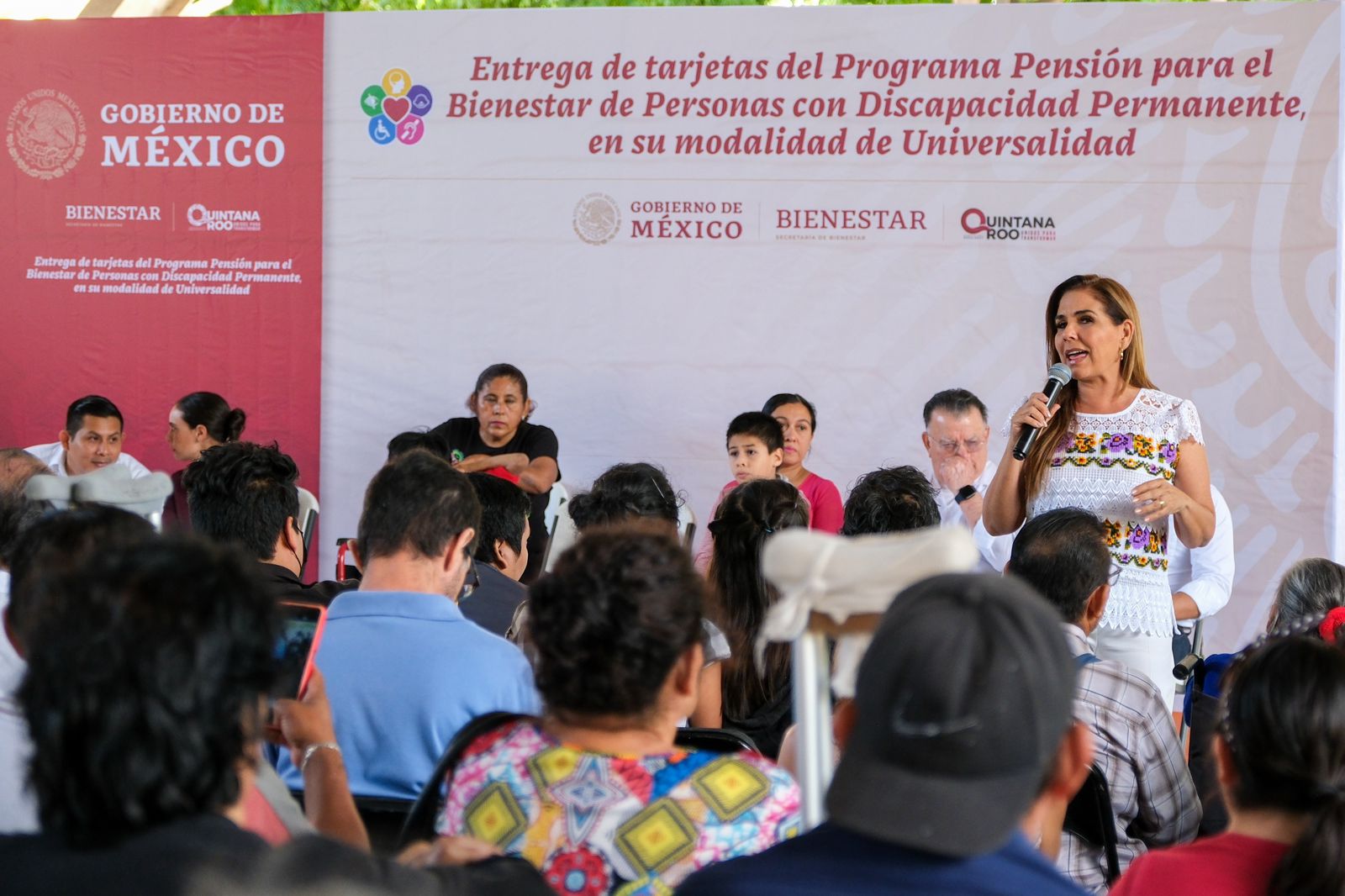 CANCÚN.- Al participar en la entrega de tarjetas del programa Pensión para el Bienestar de Personas con Discapacidad Permanente, en su modalidad universal, la gobernadora Mara Lezama Espinosa destacó que trabajando de la mano con el Gobierno de Federal y el Presidente de México, Andrés Manuel López Obrador se logra llevar este apoyo a todos los rincones del estado para ayudar a quienes más lo necesitan.