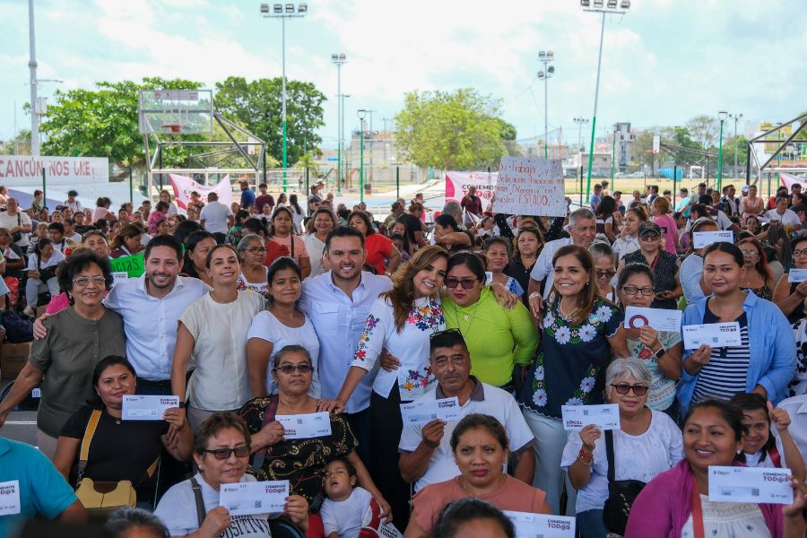 En la unidad deportiva “Toro Valenzuela” de Cancún, la gobernadora Mara Lezama, acompañada de la presidenta honoraria del DIF Quintana Roo, Verónica Lezama Espinosa, y del titular de la SEBIEN, Pablo Bustamante, entregó 700 tarjetas y paquetes alimentarios a beneficiarias y beneficiarios de este programa.