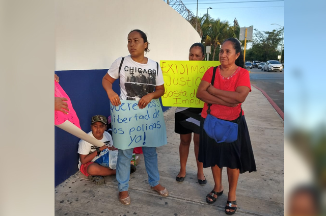 CANCÚN, Quintana Roo.-Esposas de los 19 policías que fueron detenidos la semana pasada se manifiestan en la puerta de la Secretaria Municipal de Seguridad Pública.