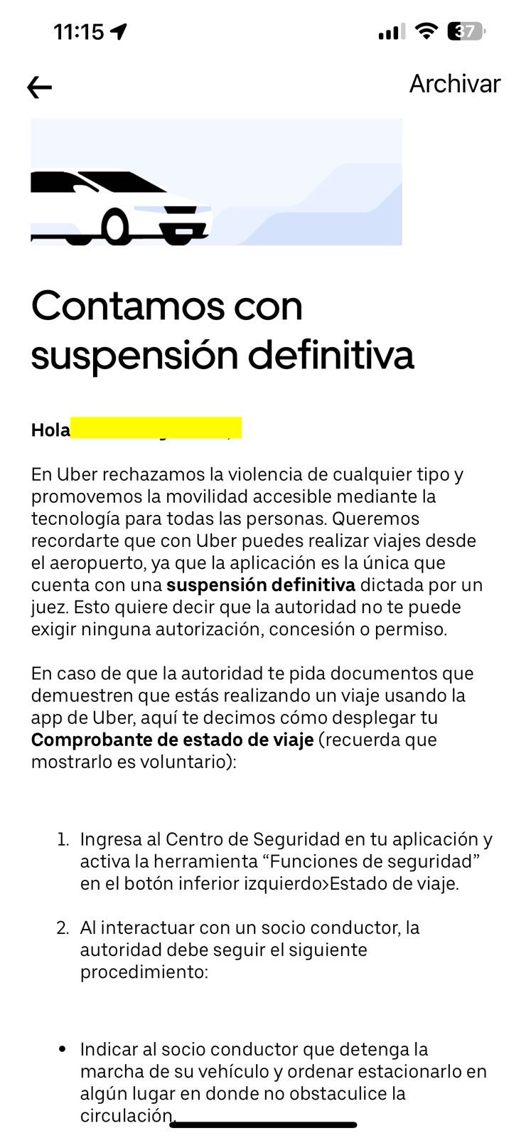 Luego de que Uber logró la suspensión definitiva, señaló que cuando un agente debidamente identificado le pida identificarse, puede hacerlo y señalarle que no requiere de permiso o concesión adicional para poder operar en el Aeropuerto Internacional de Cancún.