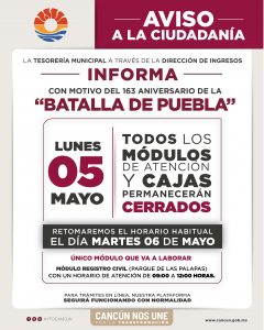 Cancún.- Con motivo del asueto por la celebración del 163 Aniversario de la Batalla de Puebla, este lunes 05 de mayo, la Tesorería Municipal y la Dirección de Ingresos del Ayuntamiento de Benito Juárez, informan a los contribuyentes que se mantendrán cerradas todas sus cajas y módulos, restableciendo las labores cotidianas el próximo martes 06 de mayo.