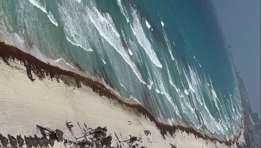 Cancún.- Un notable recale de sargazo se registró en playas de Cancún, entre ellas, Delfines, ubicada en la Zona Hotelera, coincidiendo con un cambio en las condiciones climáticas que incluyeron un cielo nublado, lluvias ligeras aisladas y viento.