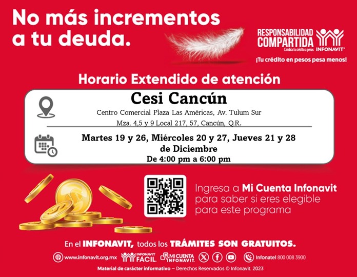 CANCÚN.- El Instituto del Fondo Nacional de la Vivienda para los Trabajadores (Infonavit) anunció que desde ayer el Centro de Servicios (Cesi) Infonavit Cancún ampliará sus horarios de atención de 4:00 a 6:00 de la tarde, adicional al horario ordinario que ofrece el centro de lunes a viernes 8:30 de la mañana a 2:30 de la tarde.