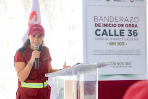Cancún,- La Presidenta Municipal, Ana Paty Peralta, reafirmó su compromiso de seguir transformando Cancún, con bienestar y con proyectos de justicia social, al dar el banderazo de inicio de obra de la Calle 36, entre la avenida Ixtepec y la Calle 159 en la Supermanzana 103, el cual a su término beneficiará a más de 7 mil ciudadanos.