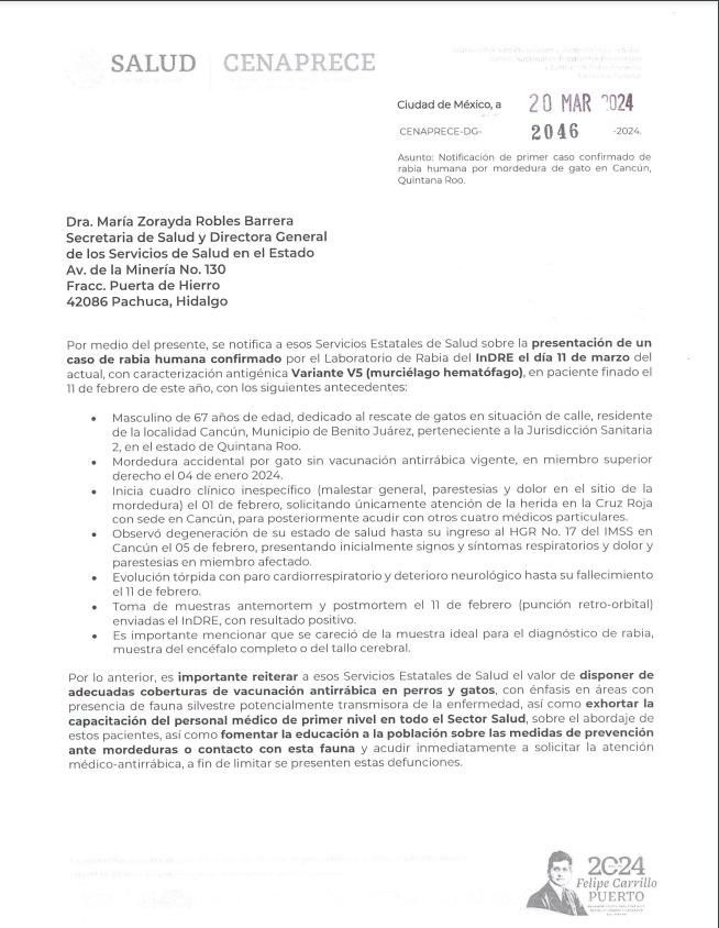 El gobierno federal confirmó el primer caso de rabia humana en Quintana Roo, producto de la mordedura de un gato en Cancún. La víctima, una persona de 67 años de edad y que fue mordida el enero, falleció en febrero pasado en el Hospital General del IMSS.