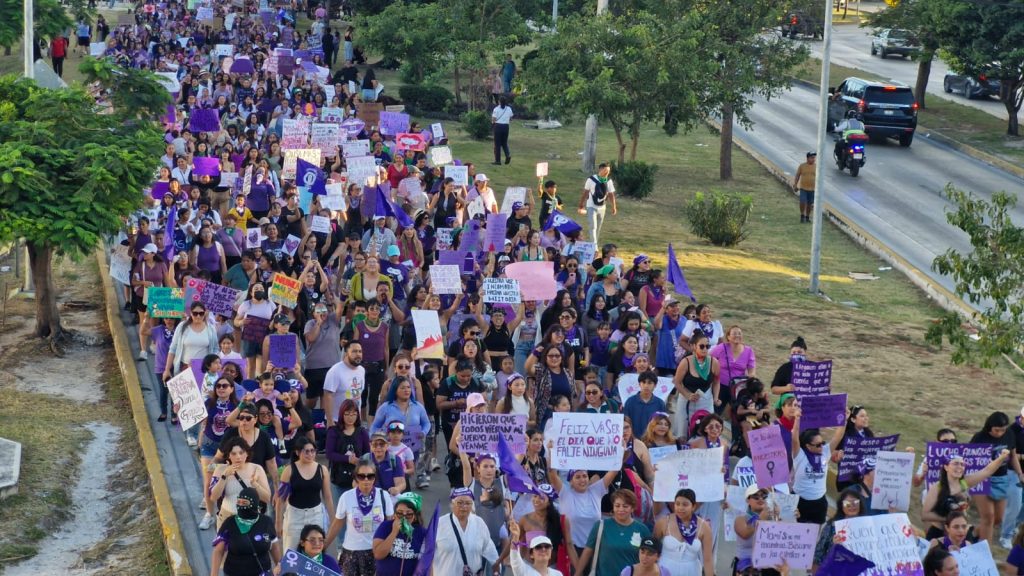 Cancún.- Entre cuatro y cinco mil mujeres marcharon esta tarde de manera pacífica por el primer cuadro para marcar el Día Internacional de la Mujer, llamado el “8M”, para exigir un fin a la violencia de género y los feminicidios.