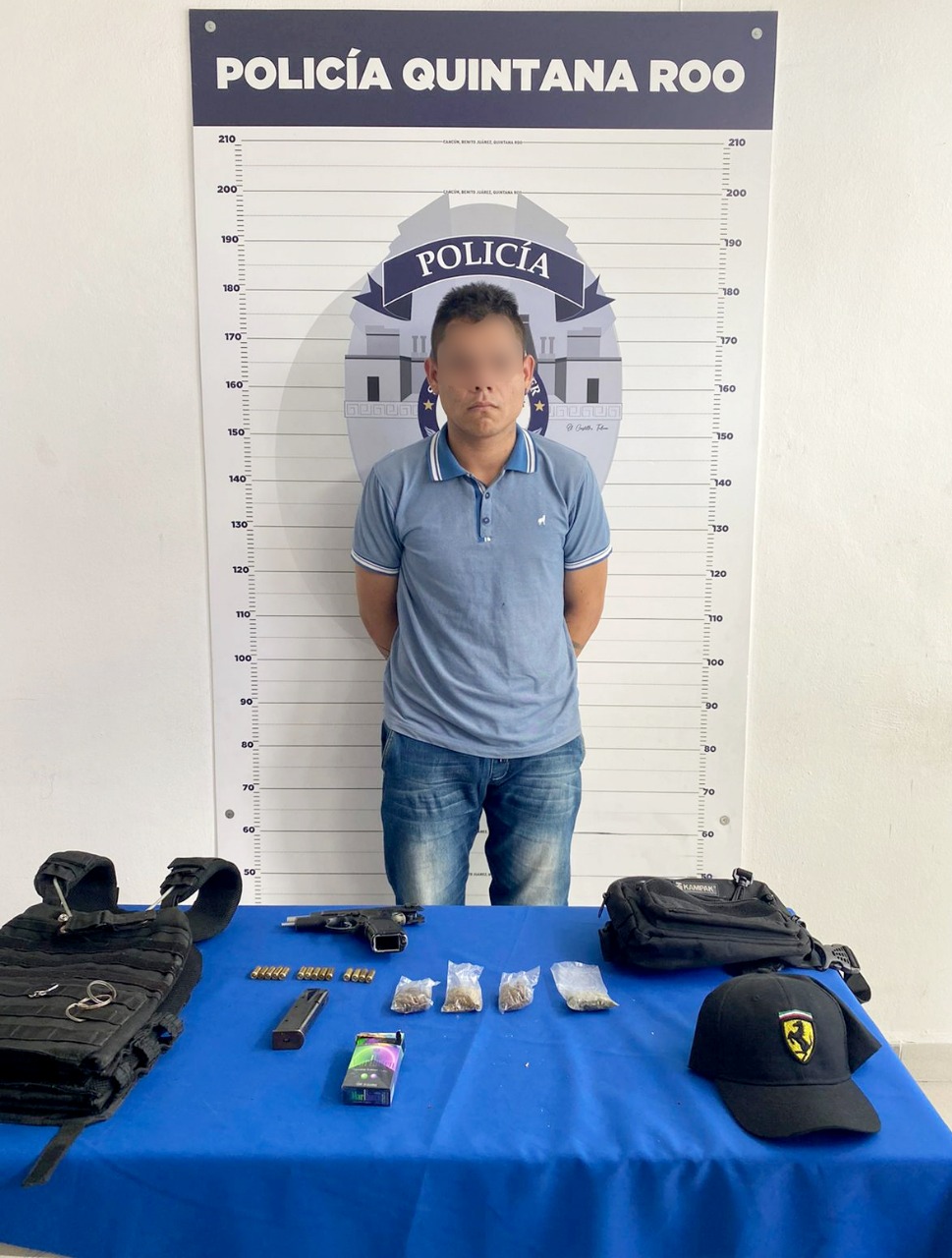 Cancún, Q. Roo a 27 de mayo 2022.- En efectivo dispositivo de seguridad, elementos de la Policía Quintana Roo en Benito Juárez lograron la detención de Enrique Ulises N., de 23 años, originario de Chiapas, oficio ayudante de albañil, por delitos contra la salud y por portación de arma de fuego de uso exclusivo de las Fuerzas Armadas.