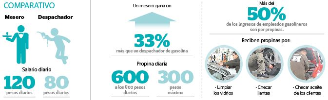 Los trabajadores de las bombas despachadores explican que los salarios de todos los empleados es muy bajo, aproximadamente 80 pesos al día, ya que ganan el mínimo, es precisamente a través de las propinas como pueden salir adelante. Estiman que en promedio sacan entre 150 a 300 pesos diarios por turno por concepto de gratificaciones.