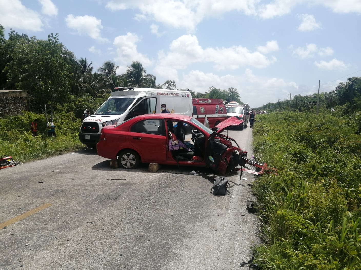 Cancún. Un trágico accidente entre dos vehículos dejó como saldo dos personas muertas y cinco lesionados, así como también daños materiales, en la carretera que conduce a Leona Vicario-Valladolid Nuevo, la mañana de ayer.