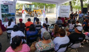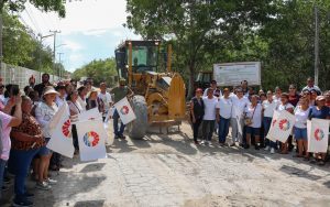 Cancún,- Para beneficio directo de la comunidad educativa y los ciudadanos que viven en la zona, la Presidenta Municipal, Ana Paty Peralta, dio el banderazo de inicio a la reconstrucción de pavimento, guarniciones, banquetas, instalación de alumbrado y balizamiento de la Calle 82, entre Avenida Bonampak y Calle 45-A, a un costado de la Universidad del Caribe, que se lleva a cabo con recursos del fondo de Saneamiento Ambiental.