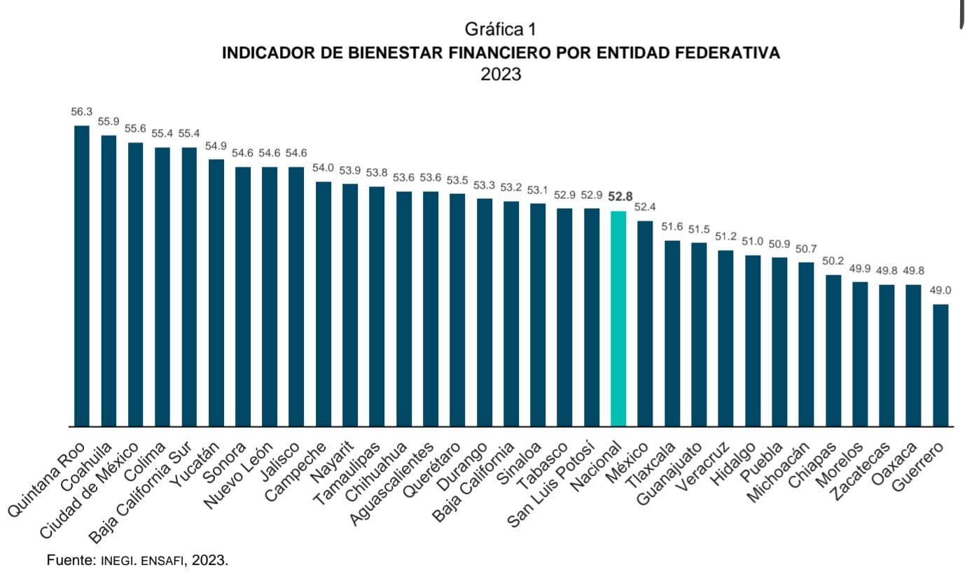Esta encuesta que se realiza por primera vez en el país arrojó que en general el bienestar financiero en México es de 52.8 puntos, mientras que, por entidad federativa, los valores más altos se reportaron en Quintana Roo, con una puntuación de 56.3 y Coahuila con 55.9.