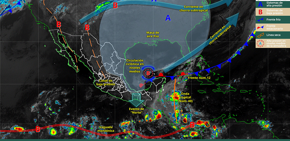El frente frío 12 se extenderá con características de estacionario sobre la Península de Yucatán e interaccionará con la nueva onda tropical número 40