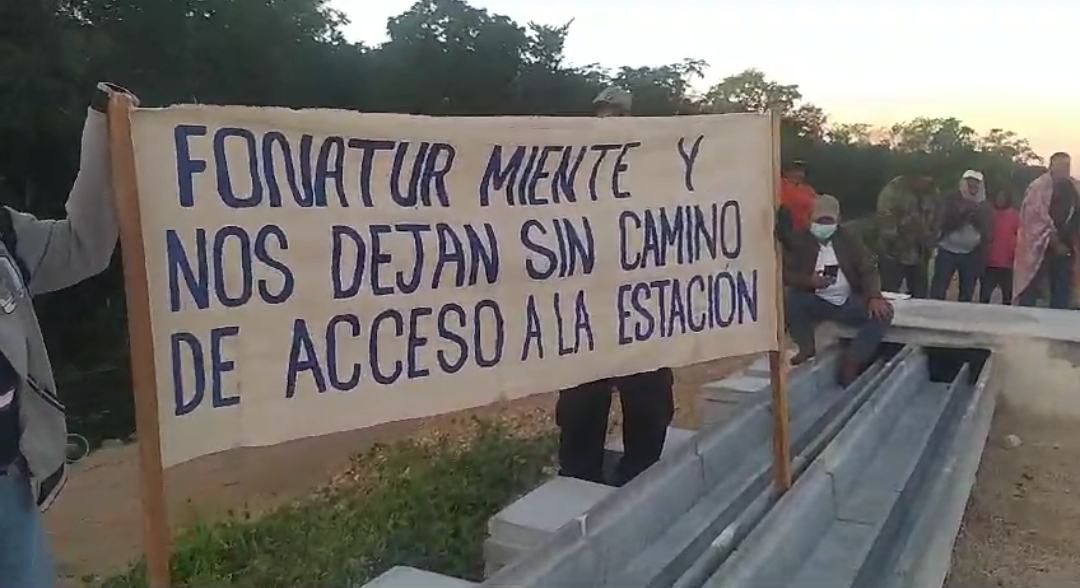 Una de las lonas tenía además un mensaje relacionado con las obras que Fonatur se comprometió a realizar en esta comunidad, para que fungieran como infraestructura complementaria a la estación del Tren Maya.