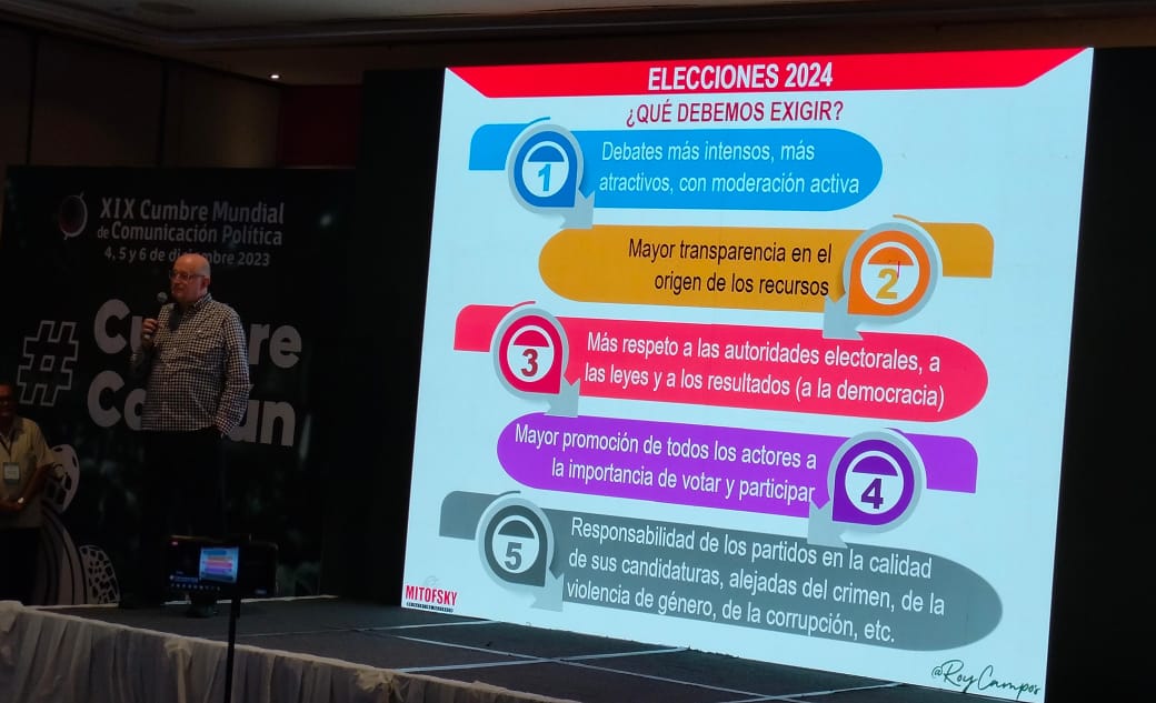CANCÚN.- Mario Campos, presidente de Grupo Mitofsky, ofreció sus perspectivas sobre la actualidad política en México, en particular, en el contexto del próximo proceso electoral donde algunas decisiones podrían repercutir de forma directa para Quintana Roo.