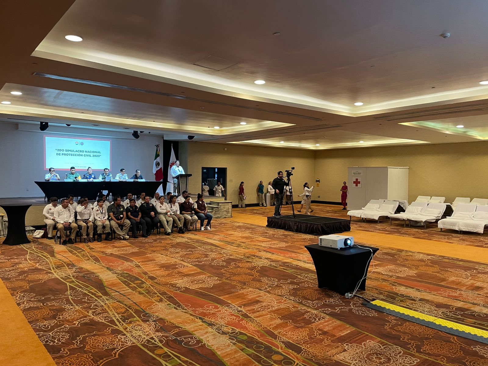 Cancún.- Como parte de las actividades por el Día Nacional de Protección Civil y sumándose a las acciones que se llevan a cabo en todo el país por el terremoto del 19 de septiembre. Autoridades municipales encabezaron un simulacro de huracán categoría 3 en las instalaciones del hotel Moon Palace en esta ciudad.