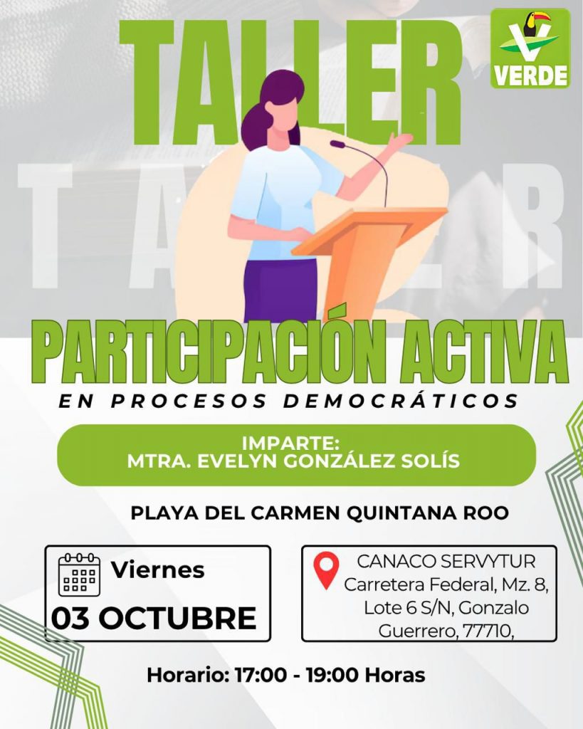 Playa del Carmen.– El Partido Verde Ecologista de México en Quintana Roo invita a la ciudadanía al taller “Participación Activa en Procesos Democráticos”, que se realizará el próximo viernes 3 de octubre a las 17:00 horas en las instalaciones de la Canaco Servytur, ubicadas en Carretera Federal Mz 8, Lote 6 S/N, colonia Gonzalo Guerrero.