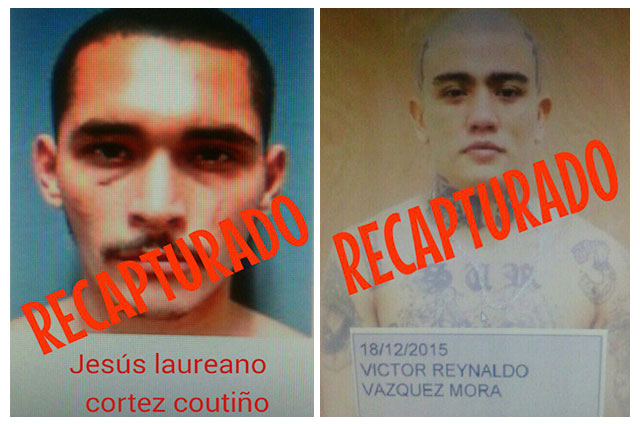 La Secretaria Estatal de Seguridad Pública (SESP) informó que se logró la recaptura de Jesús Laureano Cortez Cautiño y Víctor Reynaldo Vázquez Mora, quienes el pasado martes se fugaron del Centro de Reinserción Social (Cereso) de Cancún.