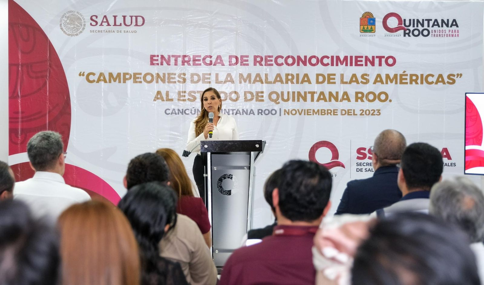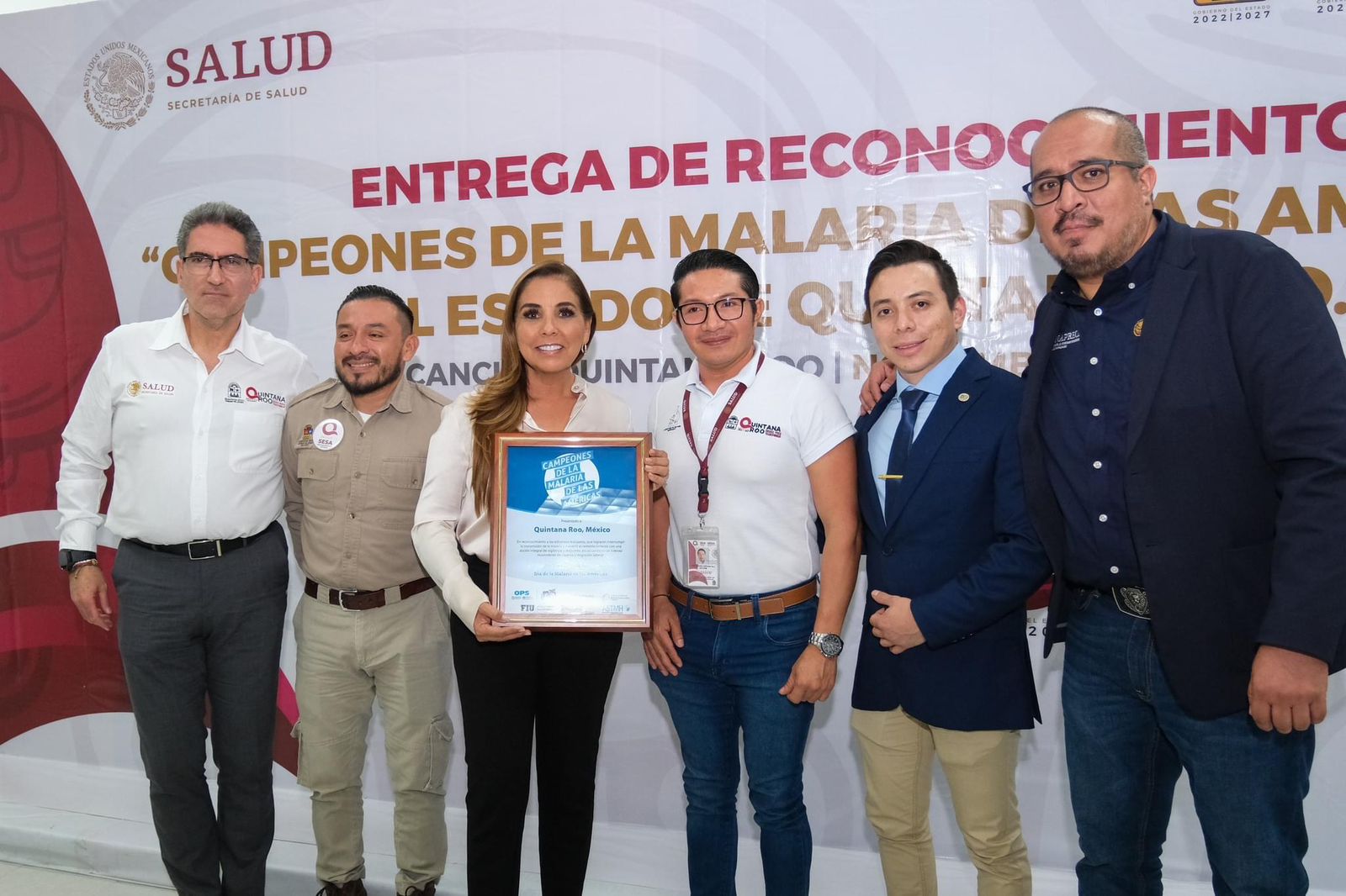 CANCÚN.- En reconocimiento al trabajo que realiza SESA, Migración, el programa de vectores, Sanidad Internacional y Epidemiología de Quintana Roo, la gobernadora Mara Lezama Espinosa recibió de manos del personal del CENAPRECE y representantes de la OPS en México, el premio “Campeones de la Malaria de las Américas 2023” que el pasado 3 de noviembre le entregó al Estado la Organización Mundial de la Salud (OMS) a través de la Organización Panamericana de la Salud (OPS).