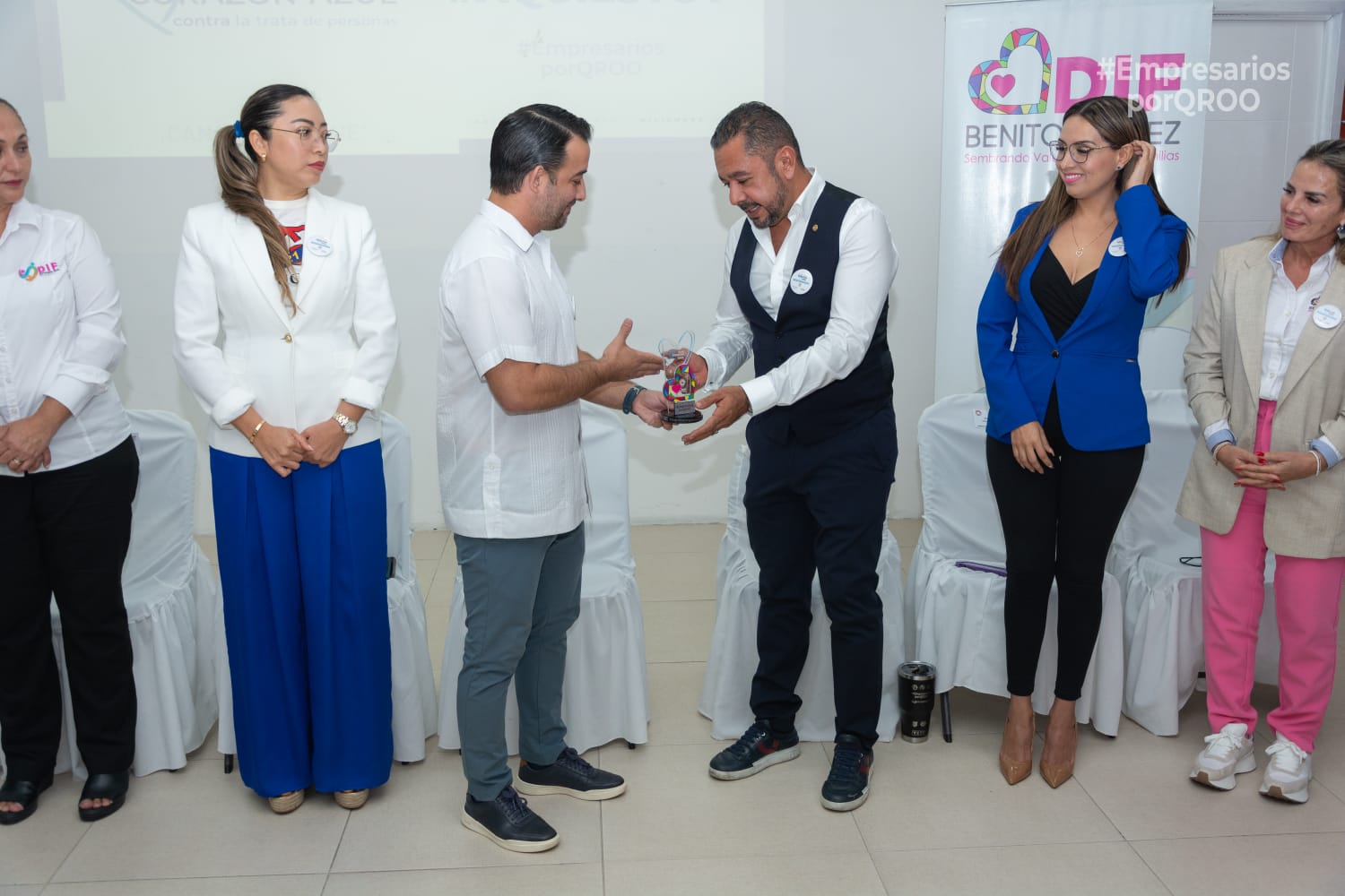 CANCÚN.- En el marco del “Taller Para Combatir la Trata de Personas, la Explotación Sexual y Laboral de Niñas, Niños y Adolescentes”, Empresarios por Quintana Roo fue distinguido con el distintivo “Corazón Azul” como reconocimiento a su compromiso en la lucha contra la trata de personas.