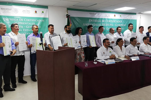 Cabe destacar que los certificados recién entregados acreditan a más de diez instituciones, entre ellas la Comisión Federal de Electricidad (CFE), el Grupo Aeroportuario de Sureste (ASUR), Turbo Gas, Mayakoba, Palace Resort, Grupo Posadas y Bepensa, por desarrollar sus actividades en el marco de una política ambiental vigente, alineada a los requisitos de los tres niveles de gobierno.
