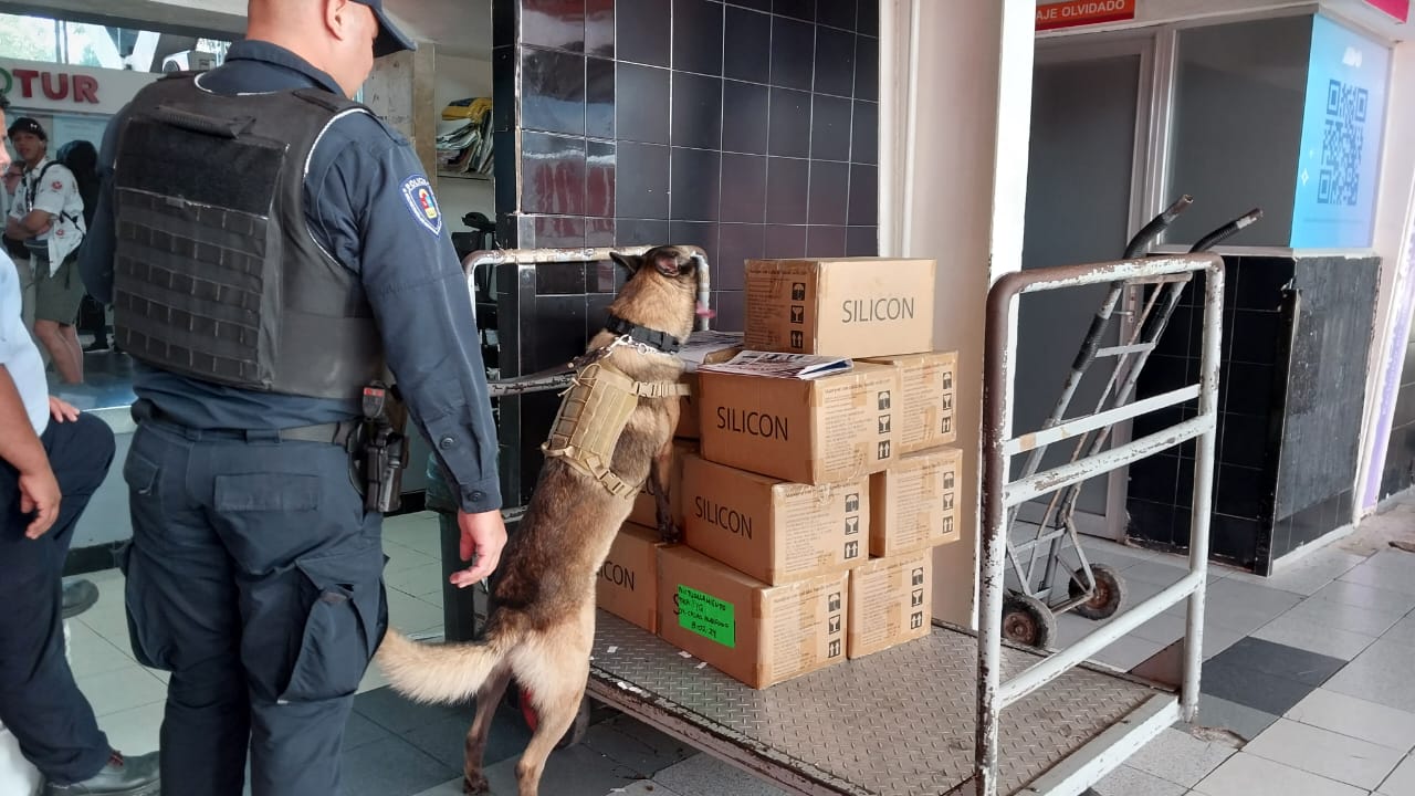 CANCÚN.- Con perros adiestrados en búsquedas de objetos, drogas, armas y explosivos policías de la Secretaría de Seguridad Ciudadana en el Estado, llevaron a cabo un despliegue con operativo en la terminal de autobuses de la empresa ADO, y sus alrededores también con el objetivo de disminuir la violencia en Cancún.