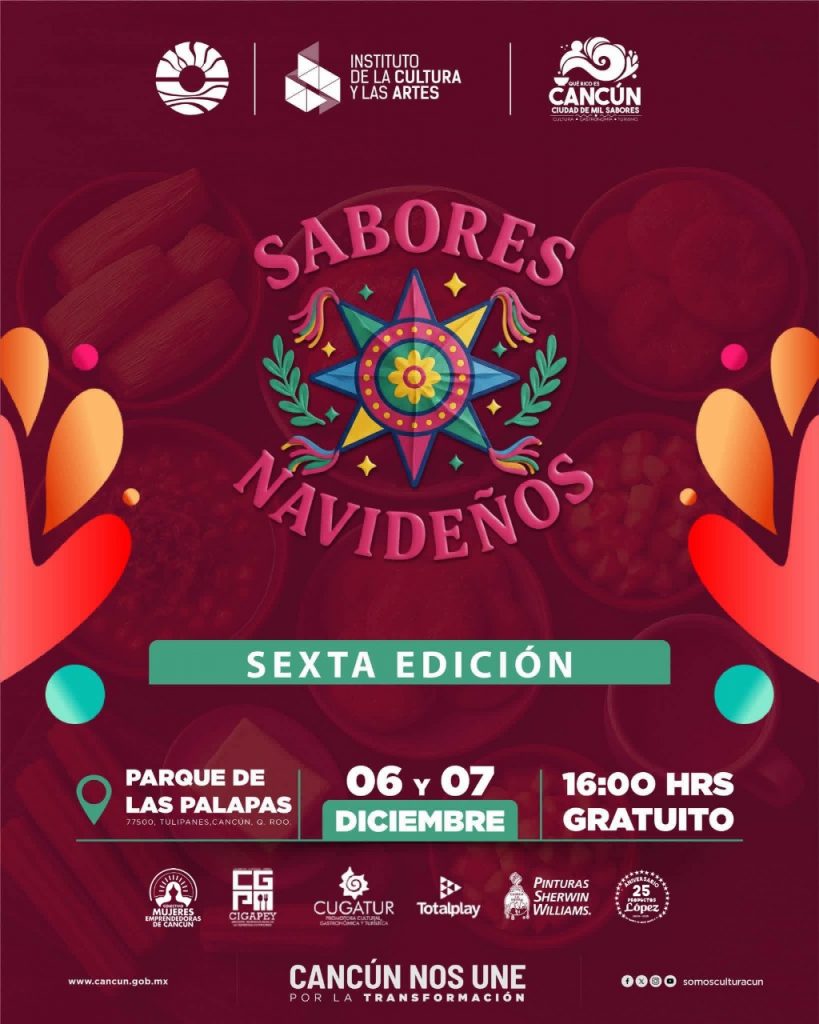 Cancún.- La temporada decembrina tomará forma los días 6 y 7 de diciembre, cuando el Parque de las Palapas se convierta en el punto de reunión para vivir la sexta edición de Sabores Navideños, una celebración que invita a disfrutar, convivir y compartir el espíritu festivo que distingue a esta época del año. A partir de las 16:00 horas, el emblemático espacio del centro de la ciudad se llenará de aromas, colores y expresiones que celebran la tradición gastronómica local.