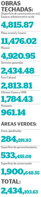 González Cano destacó que para realizar el parque en su totalidad se necesitan de 850 millones de dólares de financiamiento, ya que el lugar constará de ciclopista, puentes, los edificios de Semarnat, Profepa, un museo y un teatro abierto, entre otros atractivos, aunado a que tendrá iluminación por las noches, un cine al aire libre y una torre para la observación de aves.