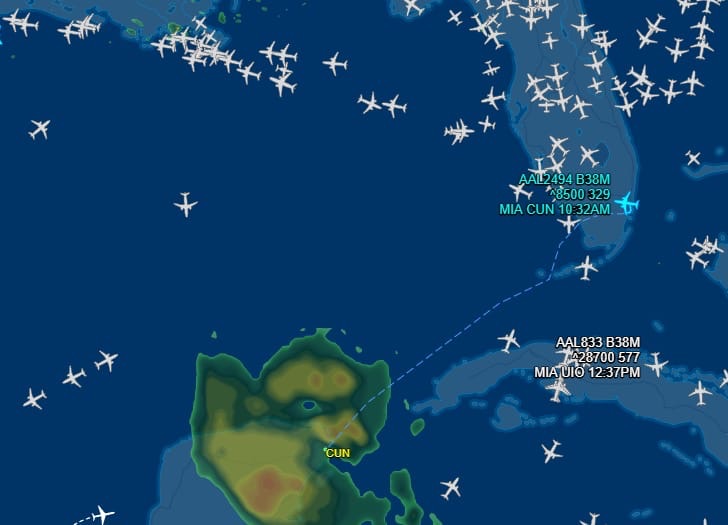 Rastreadores de vuelos muestran al mediodía que ya se dirigen dos aviones a Cancún, ambos de American Airlines, uno de Miami y el otro de Dallas.